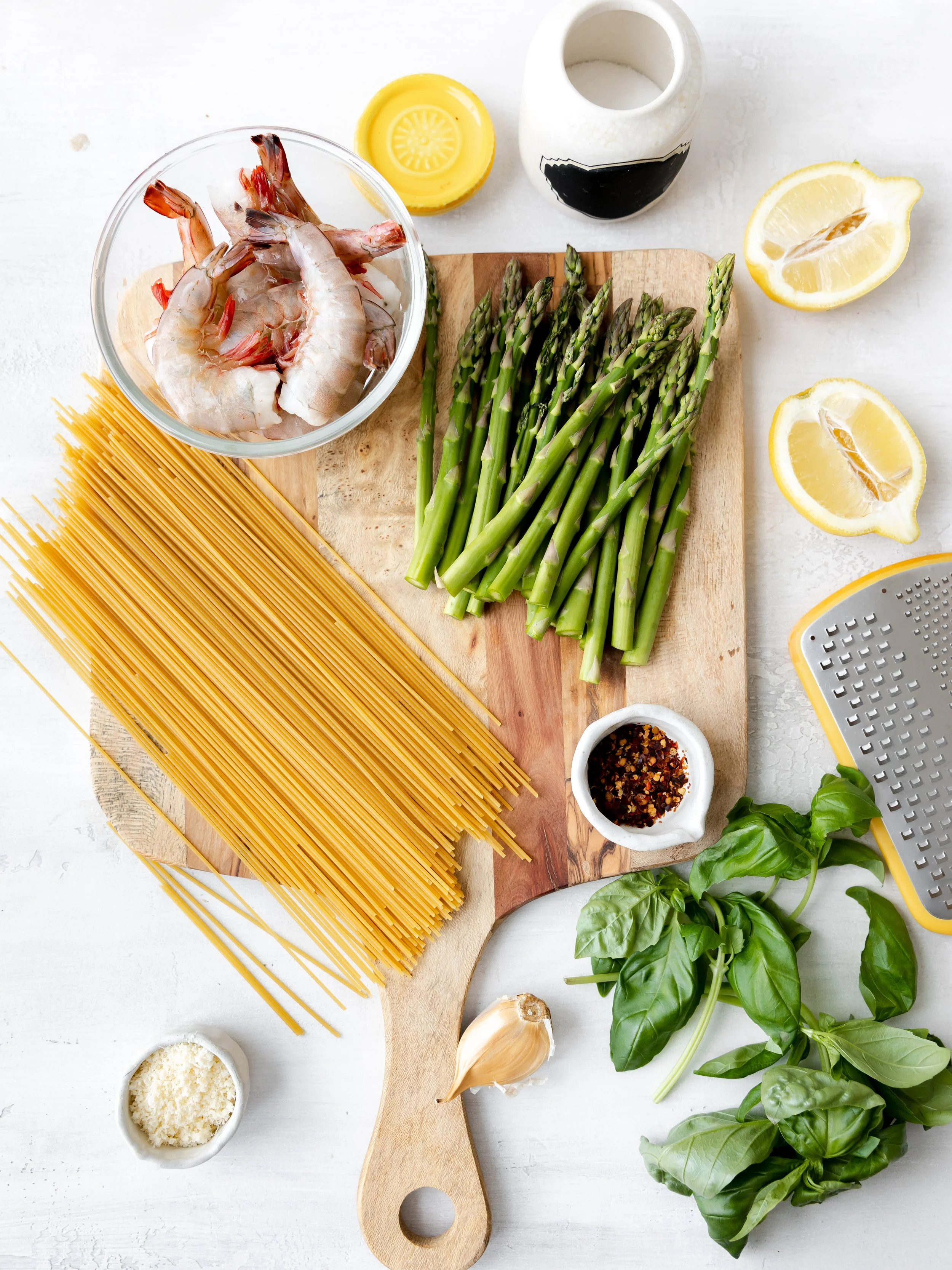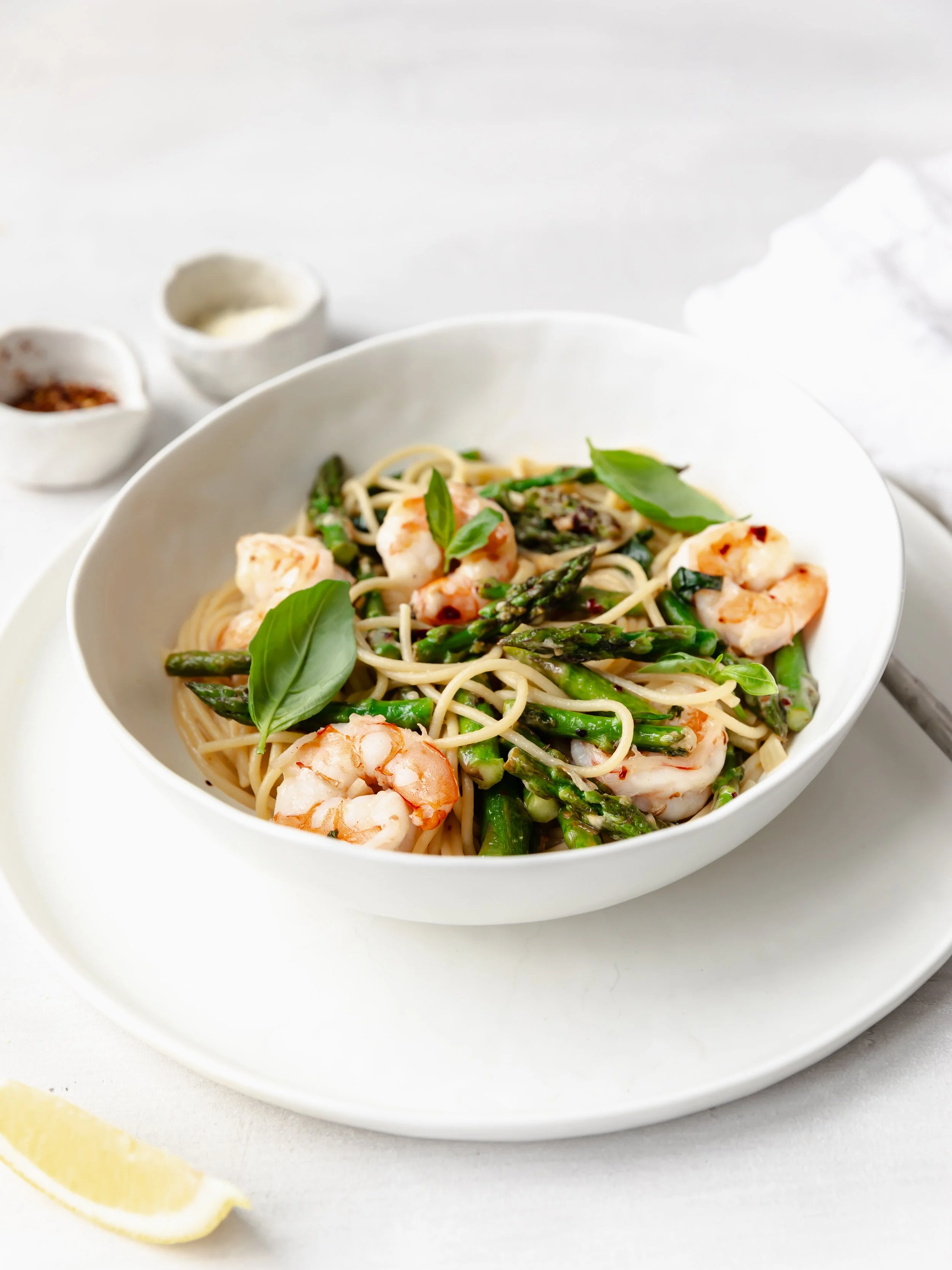 2. Meanwhile, heat olive oil in a non-stick pan over medium heat until shimmering. Add asparagus, season with salt, and cook, stirring often, about 1 minute. Add garlic, lemon zest, and red pepper flakes and cook, until fragrant, about 30 seconds; remove from heat. Add shrimp to pan and sauté for 2 to 3 minutes on each side.