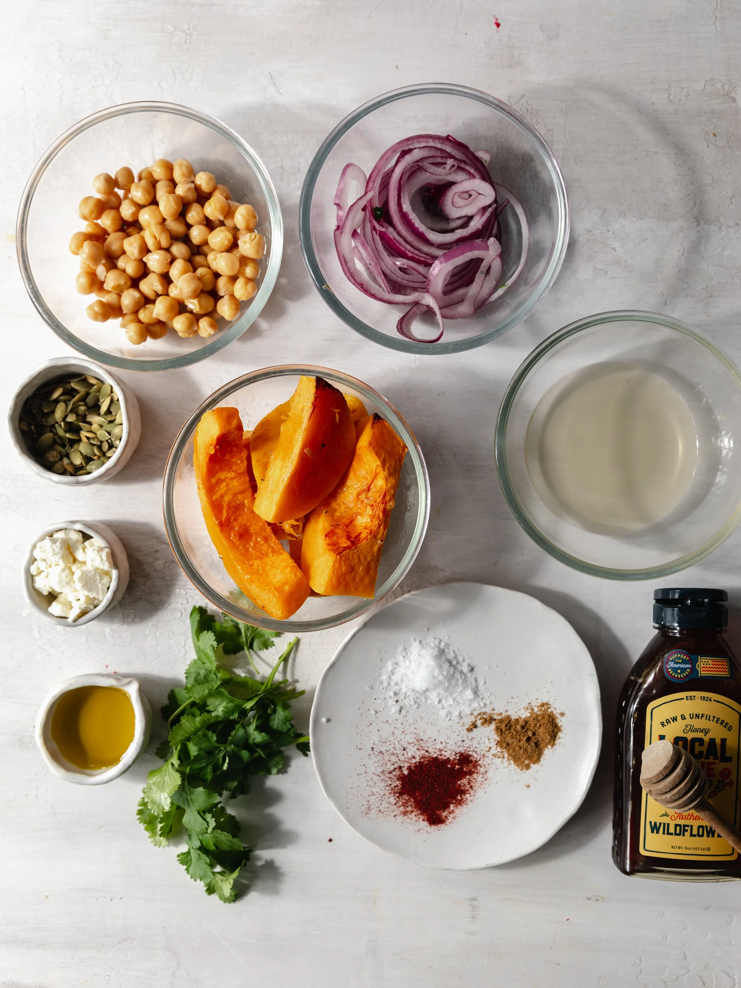 Add butternut squash, drained garbanzo beans, and red onion and gently toss until evenly coated. Plate, then top with pumpkin seeds and feta cheese.